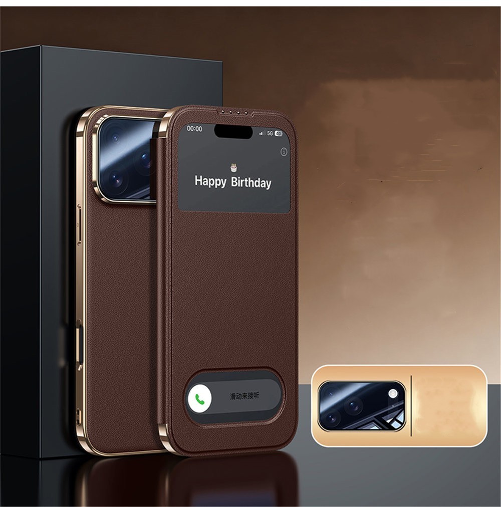 Premium Cowhide Leather Flip Case for iPhone 17 Pro 17 Pro Max Window View Cover