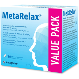 Metagenics Metarelax 180 tabletten MetaRelax® is een compleet magnesiumsupplement te gebruiken bij stressmomenten1,vermoeidheid2 en ter ondersteuning van de spieren3. MetaRelax® bevat magnesiumglycerofosfaat2,3 ,Vitamine D3 en actieve vitamines B62, B122 en B111,2, die niet omgezet hoeven te worden in het lichaam en direct worden opgenomen. Heb je een verhoogd risico op een magnesiumtekort? Mogelijke oorzaken van een magnesiumtekort: Ongezond eten is de belangrijkste oorzaak van een tekort. Voeding op basis van veel geraffineerde koolhydraten, bevat nauwelijks magnesium. Ons lichaam verbruikt ook veel magnesium bij de omzetting van geraffineerde producten, cafeine, alcohol en suiker. Mensen die veel stress hebben verbruiken meer magnesium. Maar ook als je vaak intensief sport of lichamelijk zwaar werk verricht. Sommige medicijnen, zoals maagzuurremmers of bijvoorbeeld de anticonceptiepil, kunnen zorgen voor een slechtere opname van magnesium en daardoor dus een verhoogde behoefte. Samenstelling per dagdosering van 2 tabletten % RI* Magnesiumglycerofosfaat 1800 mg - Magnesiumelement 200 mg 54% Vitamine B6 2 mg 142% Vitamine B12 25 mcg 1000% Folaat (Metafolin®) 200 mcg 100% Vitamine D 25 mcg 500% Taurine 300 mg *RI - Referentie Inname Ingredienten Magnesiumglycerofosfaat, taurine, draagstoffen: maltodextrine en hydroxypropylcellulose, antiklontermiddelen: natriumcarboxymethylcellulose, silica en magnesiumzouten van vetzuren, pyridoxal-5-fosfaat (vit. B6), calcium-L-methylfolaat, methylcobalamine (vit. B12), cholecalciferol (vit. D3) Gebruik Het aanbevolen gebruik is 2 tabletten per dag, tenzij anders geadviseerd. Bij hogere magnesiumbehoefte kunnen meer tabletten per dag ingenomen worden. Dit voedingssupplement is niet geschikt voor kinderen tot en met 3 jaar. Hoge doseringen magnesium kunnen een laxerend effect hebben. Droog, afgesloten en bij kamertemperatuur bewaren. Fabrikant Metagenics Netherlands BV Sportlaan 24 4561 KZ Hulst Aanbevolen dosering niet overschrijden. Een gevarieerde, evenwichtige voeding en een gezonde levensstijl zijn belangrijk. Een voedingssupplement is geen vervanging van een gevarieerde voeding. Buiten bereik van jonge kinderen houden. Droog, afgesloten en bij kamertemperatuur bewaren, tenzij anders geadviseerd op het etiket. Raadpleeg een deskundige alvorens supplementen te gebruiken in geval van zwangerschap, lactatie, medicijngebruik en ziekte.