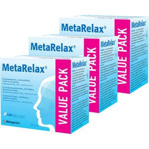 3x Metagenics Metarelax 180 tabletten MetaRelax® is een compleet magnesiumsupplement te gebruiken bij stressmomenten1,vermoeidheid2 en ter ondersteuning van de spieren3. MetaRelax® bevat magnesiumglycerofosfaat2,3 ,Vitamine D3 en actieve vitamines B62, B122 en B111,2, die niet omgezet hoeven te worden in het lichaam en direct worden opgenomen. Heb je een verhoogd risico op een magnesiumtekort? Mogelijke oorzaken van een magnesiumtekort: Ongezond eten is de belangrijkste oorzaak van een tekort. Voeding op basis van veel geraffineerde koolhydraten, bevat nauwelijks magnesium. Ons lichaam verbruikt ook veel magnesium bij de omzetting van geraffineerde producten, cafeine, alcohol en suiker. Mensen die veel stress hebben verbruiken meer magnesium. Maar ook als je vaak intensief sport of lichamelijk zwaar werk verricht. Sommige medicijnen, zoals maagzuurremmers of bijvoorbeeld de anticonceptiepil, kunnen zorgen voor een slechtere opname van magnesium en daardoor dus een verhoogde behoefte. Samenstelling per dagdosering van 2 tabletten % RI* Magnesiumglycerofosfaat 1800 mg - Magnesiumelement 200 mg 54% Vitamine B6 2 mg 142% Vitamine B12 25 mcg 1000% Folaat (Metafolin®) 200 mcg 100% Vitamine D 25 mcg 500% Taurine 300 mg *RI - Referentie Inname Ingredienten Magnesiumglycerofosfaat, taurine, draagstoffen: maltodextrine en hydroxypropylcellulose, antiklontermiddelen: natriumcarboxymethylcellulose, silica en magnesiumzouten van vetzuren, pyridoxal-5-fosfaat (vit. B6), calcium-L-methylfolaat, methylcobalamine (vit. B12), cholecalciferol (vit. D3) Gebruik Het aanbevolen gebruik is 2 tabletten per dag, tenzij anders geadviseerd. Bij hogere magnesiumbehoefte kunnen meer tabletten per dag ingenomen worden. Dit voedingssupplement is niet geschikt voor kinderen tot en met 3 jaar. Hoge doseringen magnesium kunnen een laxerend effect hebben. Droog, afgesloten en bij kamertemperatuur bewaren. Fabrikant Metagenics Netherlands BV Sportlaan 24 4561 KZ Hulst Aanbevolen dosering niet overschrijden. Een gevarieerde, evenwichtige voeding en een gezonde levensstijl zijn belangrijk. Een voedingssupplement is geen vervanging van een gevarieerde voeding. Buiten bereik van jonge kinderen houden. Droog, afgesloten en bij kamertemperatuur bewaren, tenzij anders geadviseerd op het etiket. Raadpleeg een deskundige alvorens supplementen te gebruiken in geval van zwangerschap, lactatie, medicijngebruik en ziekte.